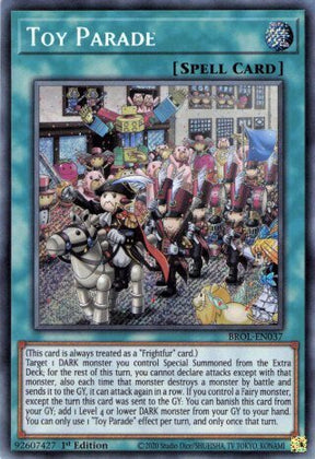 Target 1 DARK monster you control Special Summoned from the Extra Deck; for the rest of this turn, you cannot declare attacks except with that monster, also each time that monster destroys a monster by battle and sends it to the GY, it can attack again in a row. If you control a Fairy monster, except the turn this card was sent to the GY: You can banish this card from your GY; add 1 Level 4 or lower DARK monster from your GY to your hand. You can only use 1 "Toy Parade" effect per turn, and only once that turn.