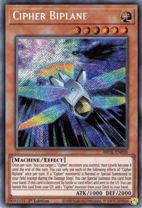 Once per turn: You can target 2 "Cipher" monsters you control; their Levels become 8 until the end of this turn. You can only use each of the following effects of "Cipher Biplane" once per turn. If a "Cipher" monster(s) is Normal or Special Summoned to your field (except during the Damage Step): You can Special Summon this card from your hand. If this card is destroyed by battle or card effect and sent to the GY: You can banish this card from your GY; add 1 "Cipher" monster from your Deck to your hand.