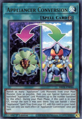 Banish as many "Appliancer" Link Monsters from your Main Monster Zone as possible, then you can Special Summon your banished "Appliancer" Link Monsters up to the number banished by this effect. During your Main Phase, if this card is in your GY, except the turn it was sent there: You can banish 1 other "Appliancer" Spell/Trap from your GY; add this card to your hand. You can only use each effect of "Appliancer Conversion" once per turn.