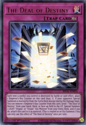 Each time a card(s) you control is destroyed by battle or card effect, place 1 Emperor's Key Counter on this card (max. 1). If your opponent Special Summons a monster(s) from the Extra Deck (except during the Damage Step): You can remove 1 Emperor's Key Counter from this card; send 1 "The Door of Destiny" from your hand, Deck, or face-up field to the GY, Special Summon 1 LIGHT "Utopia" or "Utopic" Xyz Monster from your Extra Deck, and if you do, attach this card to it as material. (This is treated as an Xyz Summon.) You can only use this effect of "The Deal of Destiny" once per turn.