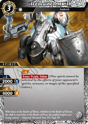 [Armor: Purple, Yellow](This spirit cannot be selected by the effects of your opponent's spirits, nexuses, or magic of the specified colors.)