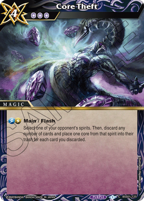 Select one of your opponent's spirits. Then, discard any number of cards and place one core from that spirit into their trash for each card you discarded.