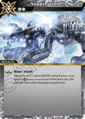 Select one spirit. It gains 3000 BP during this turn. If you spend a CORE(soul core) as part of this card's cost, that spirit can block while exhausted during this turn.