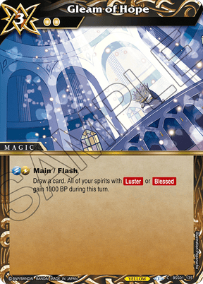Draw a card. All of your spirits with [Luster] or [Blessed] gain 1000 BP during this turn.
