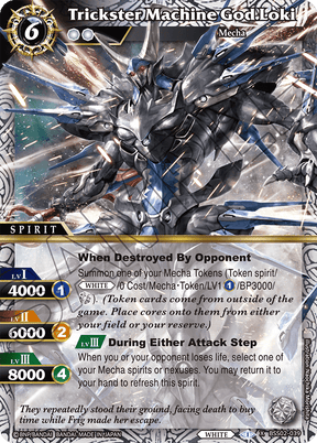 Summon one of your Mecha Tokens (Token spirit/White/0 Cost/Mecha・Token/LV1①/BP3000/CORE). (Token cards come from outside of the game. Place cores onto them from either your field or your reserve.)