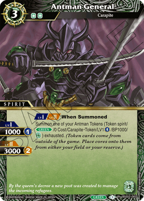 Summon one of your Antman Tokens (Token spirit/Green/0 Cost/Carapite・Token/LV1①/BP1000/CORE) exhausted. (Token cards come from outside of the game. Place cores onto them from either your field or your reserve.)
