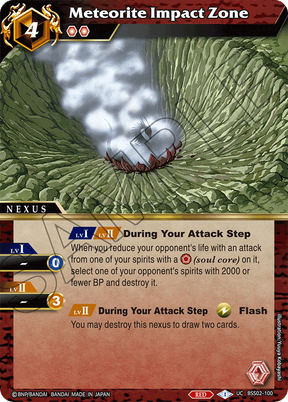 When you reduce your opponent's life with an attack from one of your spirits with a CORE(soul core) on it, select one of your opponent's spirits with 2000 or fewer BP and destroy it.