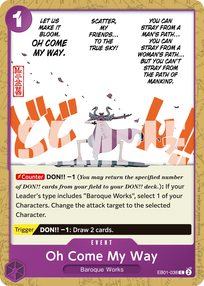 Effect - [Counter] DON!! −1 (You may return the specified number of DON!! cards from your field to your DON!! deck.): If your Leader's type includes "Baroque Works", select 1 of your Characters. Change the attack target to the selected Character.