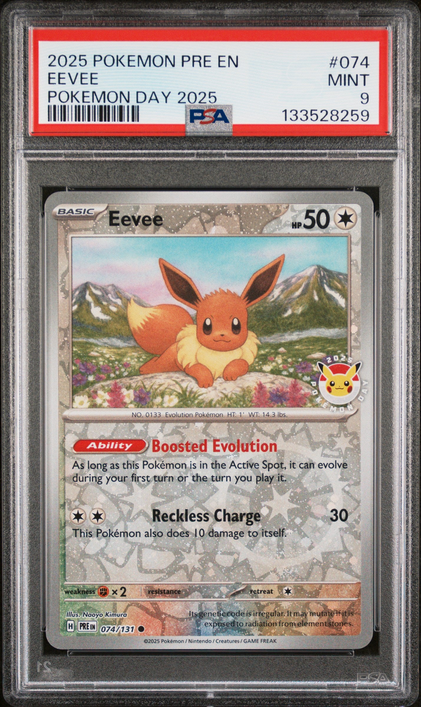 2025 POKEMON PRE EN-PRISMATIC EVOLUTIONS #074 EEVEE POKEMON DAY 2025 PSA 9