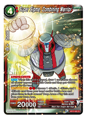 Dragon Ball Super Super Sigma, Combining Warrior Regular Rare Skill [Barrier][Blocker] [Auto] When this card is played, draw 1 card, then choose all of your opponent’s Battle Cards and they get -10000 power for the turn. [Activate : Battle](Red)(Red), choose 1 , 1 , and 1 card from your hand and/or Battle Area and place them in their owners’ Drop Areas : Play this card from your Drop Area. From Ultimate Squad Set