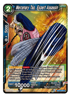 Dragon Ball Super Mercenary Tao, Expert Assassin Regular Common Skill [Activate : Main][Limit 1] Choose 1 of your 《Red Ribbon Army》 cards with an energy cost of 2 or less and place it in its owner's Drop Area : Play this card from your hand. Additionally, if you used this skill to place a card in your Drop Area, this card gets +5000 power for the turn. From Ultimate Squad Set