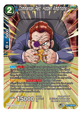 [Auto][Limit 1] When this card attacks, look at up to 3 cards from the top of your deck, play up to 1 blue 《Red Ribbon Army》 card with an energy cost of 2 or less other than copies of this card among them, then place the remaining cards at the bottom of your deck in any order. [Activate : Main][Once per turn] Choose 1 of your other 《Red Ribbon Army》 cards and place it in its owner's Drop Area : Choose up to 1 of your opponent's Battle Cards with an energy cost of 4 or less and place it at the bottom of its owner's deck.