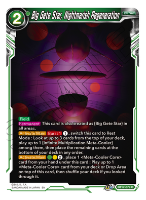 [Field] [Permanent] This card is also treated as {Big Gete Star} in all areas. [Activate : Main][Burst 1](1), switch this card to Rest Mode : Look at up to 3 cards from the top of your deck, play up to 1 {Infinite Multiplication Meta-Cooler} among them, then place the remaining cards at the bottom of your deck in any order. [Activate : Main](Green)(Yellow)(2), place 1 card from your hand under this card : Play up to 1 card from your deck or Drop Area on top of this card, then shuffle your deck if you looked through it.