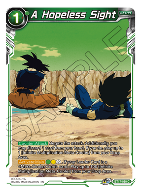 [Counter : Attack] Negate the attack. Additionally, you may discard 1 card from your hand. If you do, play up to 1 {Infinite Multiplication Meta-Cooler} from your Drop Area. [Activate : Main](Green)(Yellow)(2), if your Leader Card is a card : Play up to 100 {Infinite Multiplication Meta-Cooler} from your Drop Area.