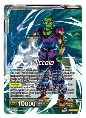 [Auto] Place 1 《Namekian》 card from your hand under this card : When this card attacks, draw 1 card, then look at up to 5 cards from the top of your deck, add up to 1 green or yellow 《Namekian》 card among them to your hand, and shuffle your deck. [Awaken] When your life is at 4 or less or there are 2 or more cards under this card : You may draw 1 card, switch up to 1 of your energy to Active Mode, add cards from your life to your hand until you have 5 life left, and flip this card over.