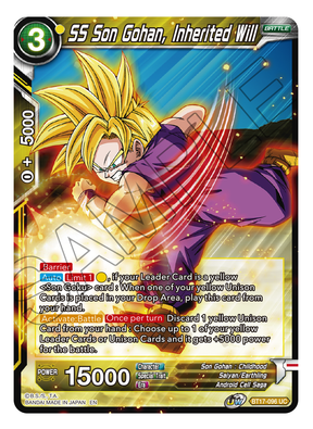 Dragon Ball Super SS Son Gohan, Inherited Will Regular Uncommon Skill [Barrier] [Auto][Limit 1](Yellow), if your Leader Card is a yellow card : When one of your yellow Unison Cards is placed in your Drop Area, play this card from your hand. [Activate : Battle][Once per turn] Discard 1 yellow Unison Card from your hand : Choose up to 1 of your yellow Leader Cards or Unison Cards and it gets +5000 power for the battle. From Ultimate Squad Set