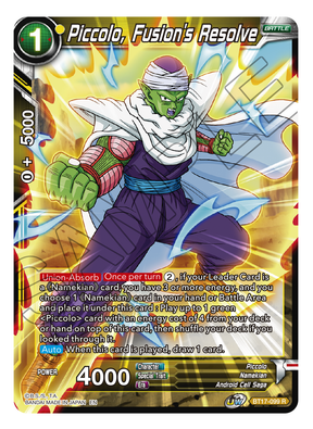 Dragon Ball Super Piccolo, Fusion's Resolve Regular Rare Skill [Union-Absorb][Once per turn](2), if your Leader Card is a 《Namekian》 card, you have 3 or more energy, and you choose 1 《Namekian》 card in your hand or Battle Area and place it under this card : Play up to 1 green card with an energy cost of 4 from your deck or hand on top of this card, then shuffle your deck if you looked through it. [Auto] When this card is played, draw 1 card. From Ultimate Squad Set