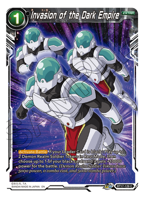 [Activate : Battle] If your Leader Card is black : Play up to 2 Demon Realm Soldier Tokens in Rest Mode, then choose up to 1 of your black cards and it gets +10000 power for the battle. (Demon Realm Soldier Tokens have 5000 power, 0 combo cost, and 5000 combo power.)