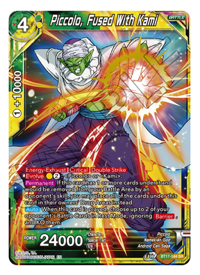 Dragon Ball Super Piccolo, Fused With Kami Super Rare / SR Skill [Energy-Exhaust][Critical][Double Strike] [Evolve](Yellow)(2) : or . [Permanent] If this card has 1 or more cards under it and would be removed from your Battle Area by an opponent's skill, you may place all of the cards under this card in their owners' Drop Areas instead. [Auto] When this card is played, choose up to 2 of your opponent's Battle Cards in Rest Mode, ignoring [Barrier], and KO them. From Ultimate Squad Set